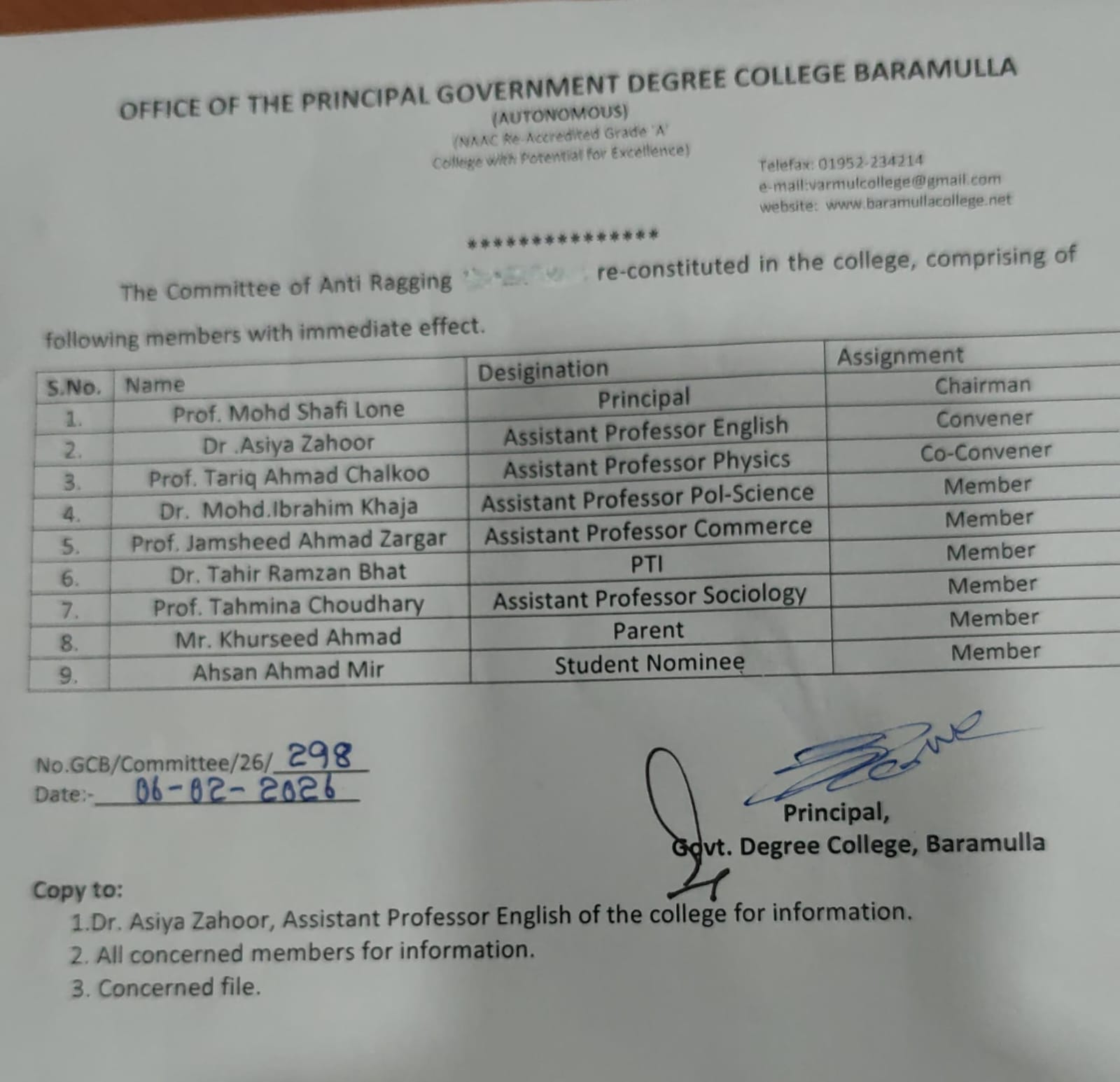 Committee constituted for controlling the menace of ragging.