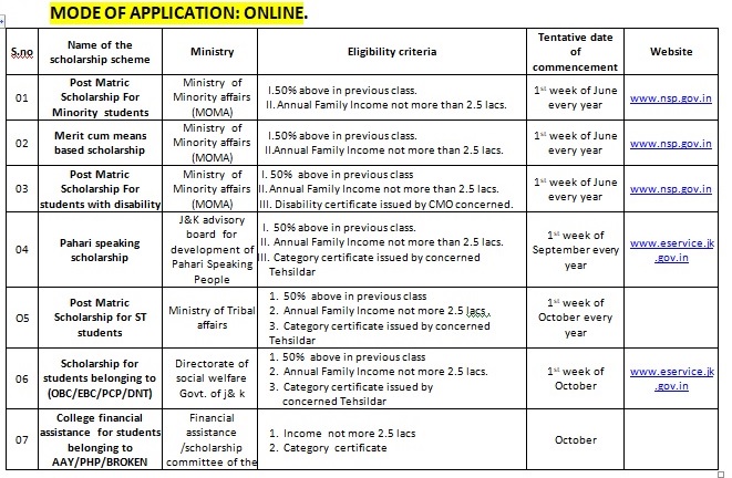 Financial aid/scholarship is granted to the students belonging to poor families by the college. Many other scholarships are provided to the students belonging to minorities by Govt. every year. Students of Reserved categories like SC ST etc are entitled to receive financial assistance under various schemes of central Government, social welfare and Higher education department Jammu and Kashmir. Students are advised to develop habit of reading notices on the notice board/website for information and procedure. The list of scholarships /financial assistance schemes is as under.
